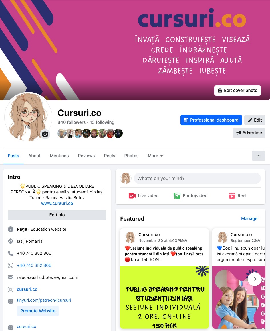 Cursurile și atelierele de public speaking & dezvoltare personală pentru elevii și studenții din Iași sunt organizate și susținute de Raluca Vasiliu Botez, director de marketing Agenția TOP, care este responsabilă și de crearea suporturilor de curs, conținutului pentru paginile de social media (peste 800 de postări) și de redactarea articolelor destinate copiilor și părinților acestora.